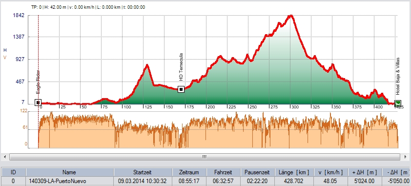 Nach dem Tanken fuhren wir weiter abseits der grossen Interstates und Highways auf kleineren sehr kurvenreichen Strassen süd(ost)wärts nach Tecate an die mexikanische Grenze. Der Grenzübertritt ging reibungslos und zügig von statten und danach fuhren wir südwestwärts Richtung Pazifikküste. Die grosse Grenzstadt Tijuana liessen wir dabei rechts liegen. Das letzte Stück der Strecke war recht mühsam zu fahren, denn wir fuhren direkt in die tiefstehende Sonne hinein, was doch sehr blendete und die Sicht auf die Strasse und das vorausfahrende Bike recht hinderte.
