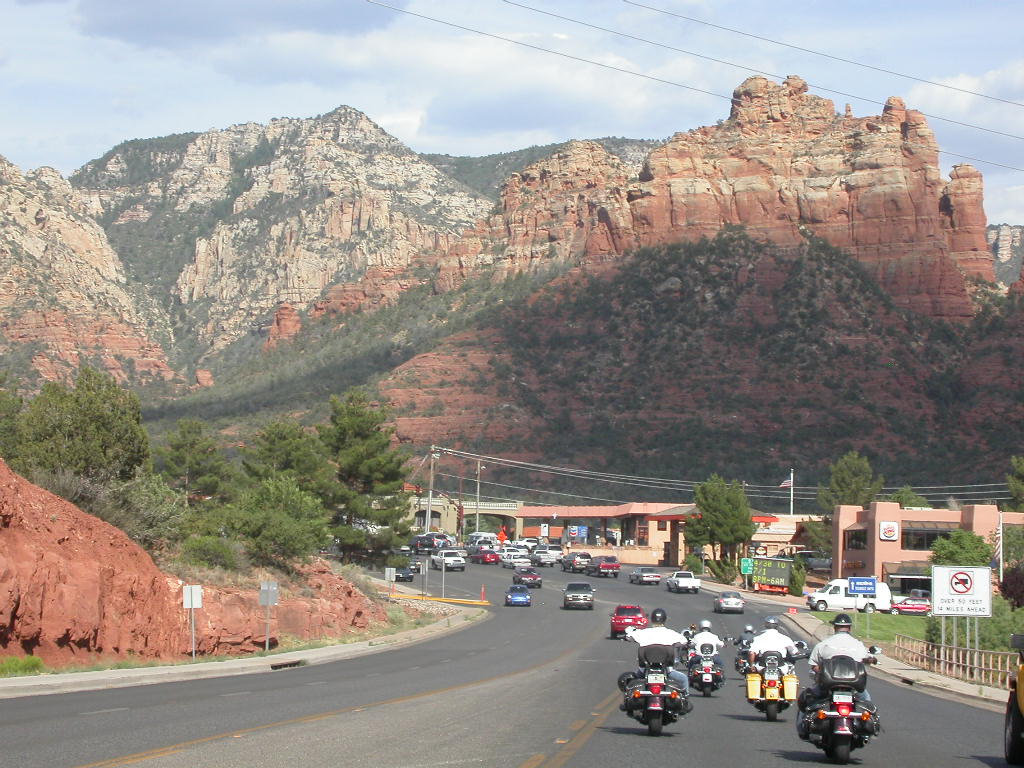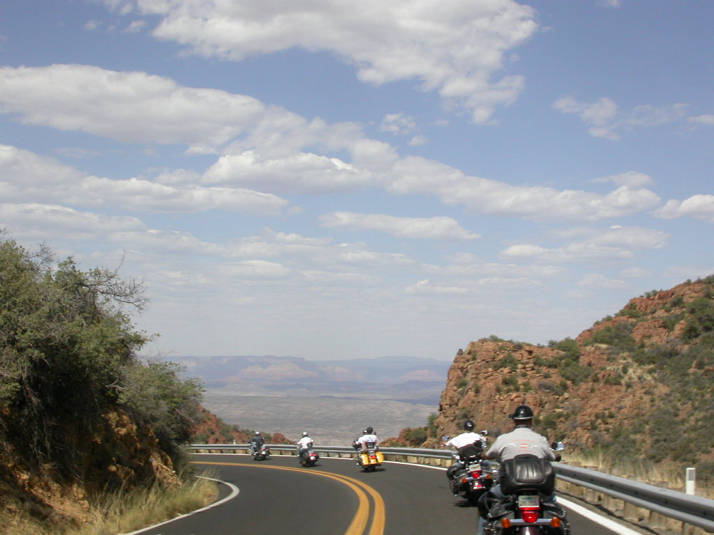 Danach flogen wir weiter tief Richtung Prescott und dann über eine schöne kurvenreiche Strecke Richtung Jerome kurz vor Sedona. Leider war hier dann gegenüber dem freien Jagen kollektives Gruppenfahren im 'Bergaufbremsertempo' angesagt, was dem Spass an dieser schönen Strecke doch etwas den Reiz nahm, dasselbe galt trotz Nachfrage zum freien Fahren auch für die Strecke von Sedona durch den malerischen Oak Creek Canyon nach Flagstaff. Bei zwei Kreuzungen wo man rechts abbiegen muss, könnte man sich ja verfahren ...