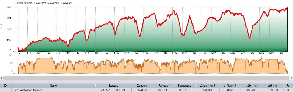 Wir nahmen erneut ein Stück Autobahn um nicht durch das Verkehrsgewümmel von Casablanca zu fahren. Das erste Stück Route war identisch mit der, wie wir sie mit dem SUV nach Beni Mellal gefahren sind.