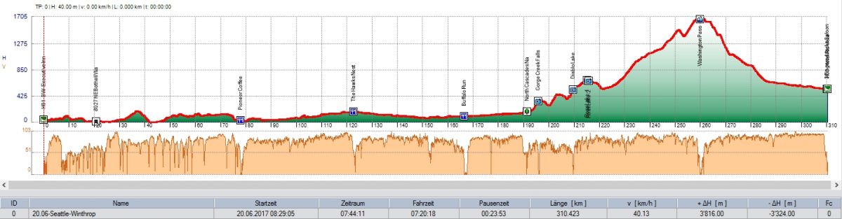 Wir verlassen Seattle in nördlicher Richtung und schon bald sind wir auf einsamen Strassen und erreichen den North Cascades Nationalpark. Der North Cascades Highway führt uns entlang des Skagit Rivers, dem Lake Diablo und Ross Lake mit schönen Aussichtspunkten zum höchsten Punkt des Highways, dem Washington Pass. Durch das Metthow Valley kommen wir zu unserem Übernachtungsort Winthrop.