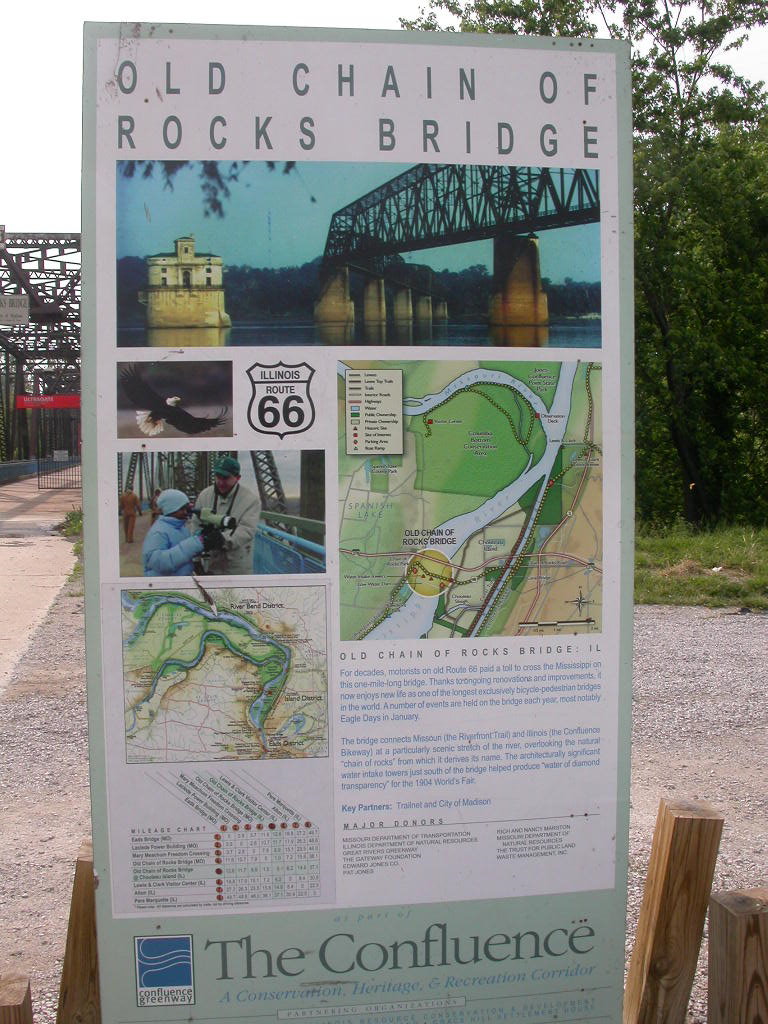 Früher überquerte die '66' den Mississippi unter Anderem auch über die "Chain of Rocks Bridge". Doch für den heutigen Schwerverkehr ist sie wohl zu wenig tragfähig und ausserdem viel zu schmal. So dürfen 'offiziel' nur noch Füssgänger und Fahrräder die Brücke benutzen...