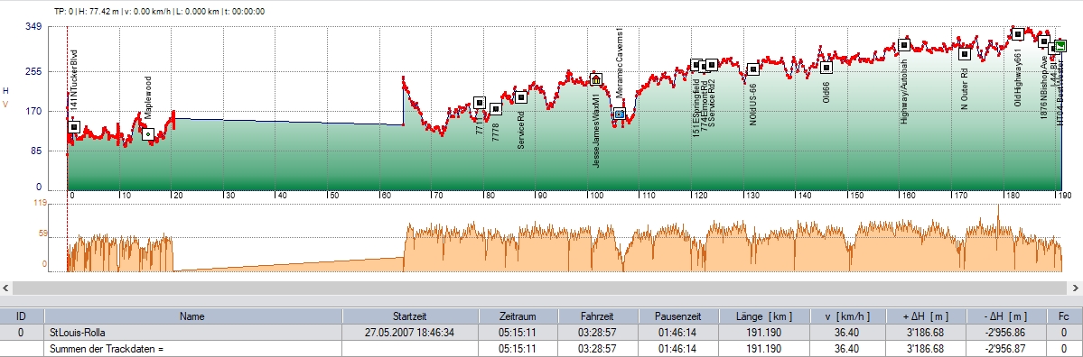 Ab Mittag hatte uns dann die Route 66 wieder und durch die hügligen Ozarks kam auch endlich etwas mehr Bikerfeeling auf : Kurven und ein ewiges auf und ab durch diese Hügel. Nach dem einsetzenden Regen beschlossen wir auf den Besuch von Jesse Jame's Versteck, den "Memarec Caverns" zu verzichten und direkt nach Rolla zu fahren.