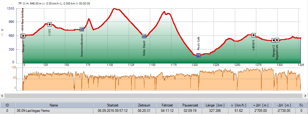 Auf der Interstate fuhren wir aus Las Begas hinaus, machten bei einem Sonnenenergiepark kurz Halt und bogen schon bald in die Mojave Wüste ab. Kurz vor Roy's Cafe trafen wir wieder auf die 66 und dort assen wir auch was zu Mittag. Wer hier Tanken muss hat einerseits Glück dass hier mitten in der Wüste eine Tanke ist, andererseits auch Pech, denn der Preis für eine Gallone ist praktisch doppelt so hoch wie anderswo.