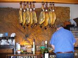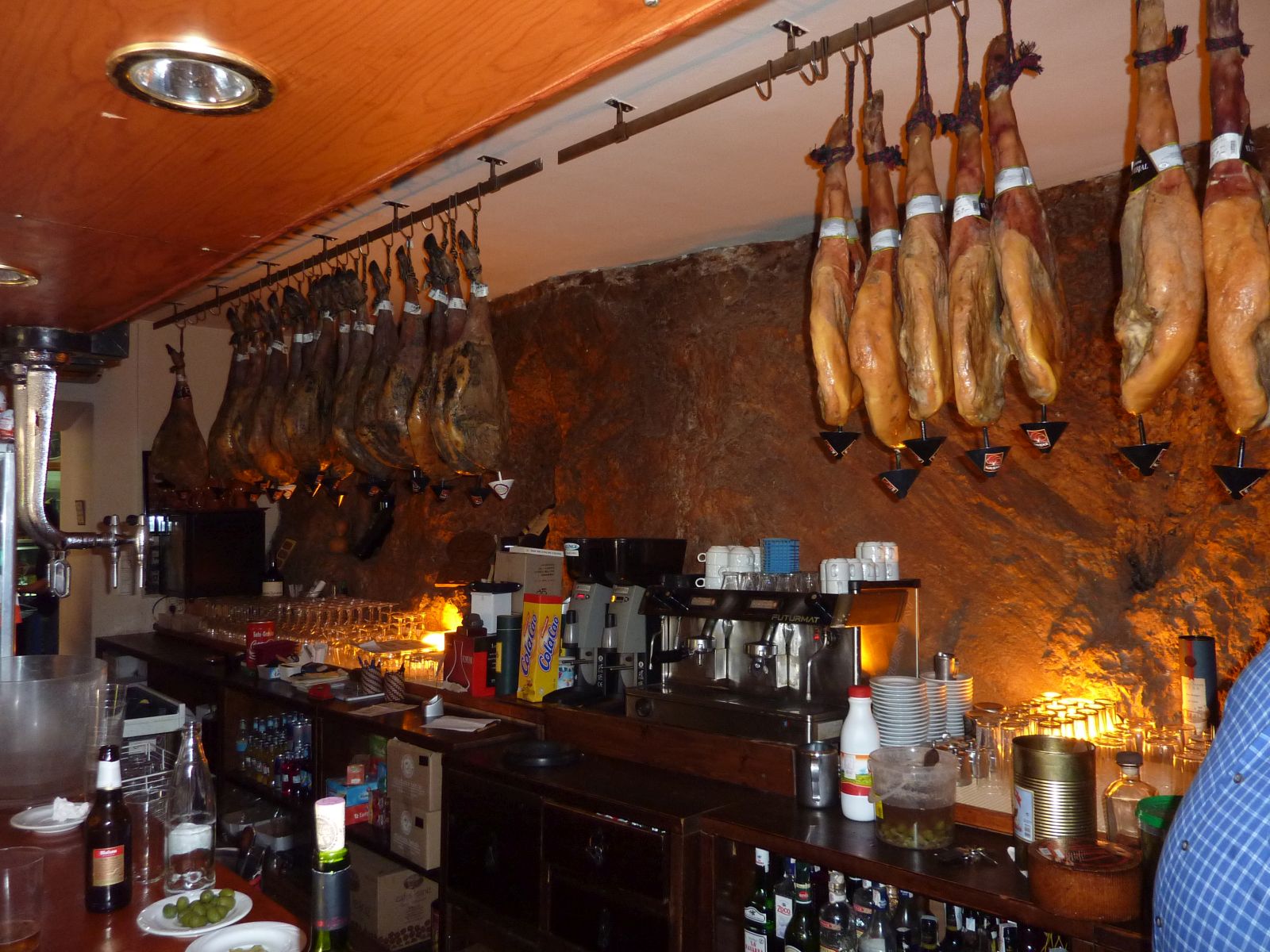 Die Strasse, welche uns am Nachmittag gegen den Cañon del Rio Lobos führte, erinnerte stark an die weiten Hügelstrasse i^m Süden von Arizona und New Mexiko. Beim Mirador de la Galiano hielten wir an und genossen die Ruhe und die Aussicht in den Canõn hinein. Die Strecke führte uns anschliessend kurvenreich zum Rio hinunter. Beim Ausgang des Cañons in Ucero lag eine Bodega, welche zu einem Rast einlud. Im Innern des Restaurants war das Cheminée eingeheizt und viele Besucher am Essen. Das Gebäude war an den Fels gebaut, so dass dieser eine natürliche Rückwand bot. Hinter der Theke hingen viele frische Jamons de Serrano, welche zu eine Racion einluden, doch wir verzichteten diesmal und tranken nur etwas.