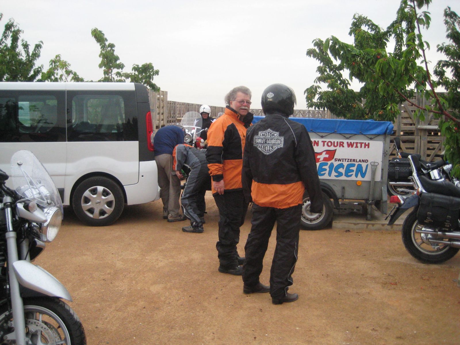 Nach dem Frühstück sah es zu Beginn noch trocken aus, doch je näher die Abfahrt kam begann es wieder zu regnen und jeder zog seinen Regenschutz an.
